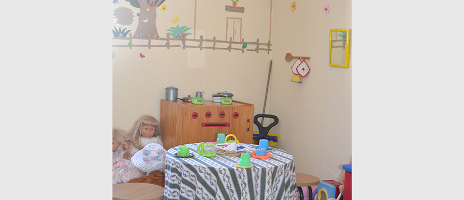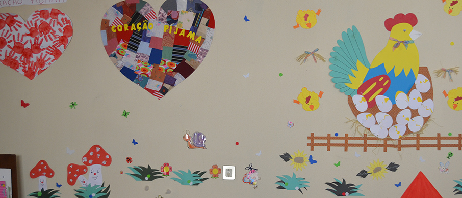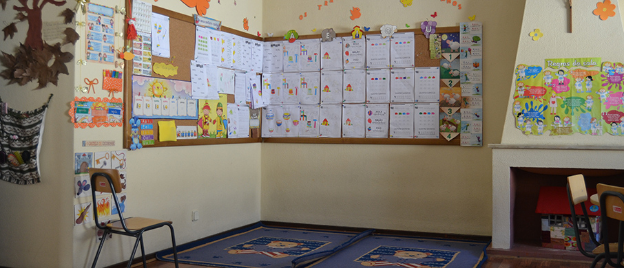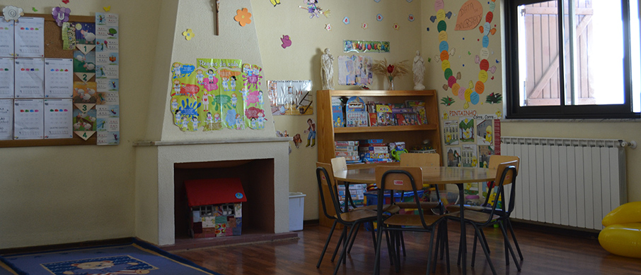 As crianças desenvolvem as suas atividades numa ampla sala equipada com meios e recursos adequados para a idade e grau de desenvolvimento de cada criança.